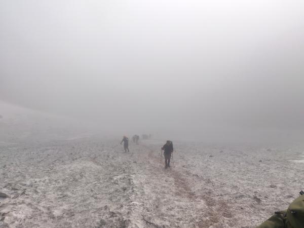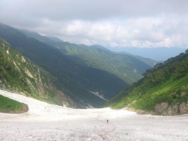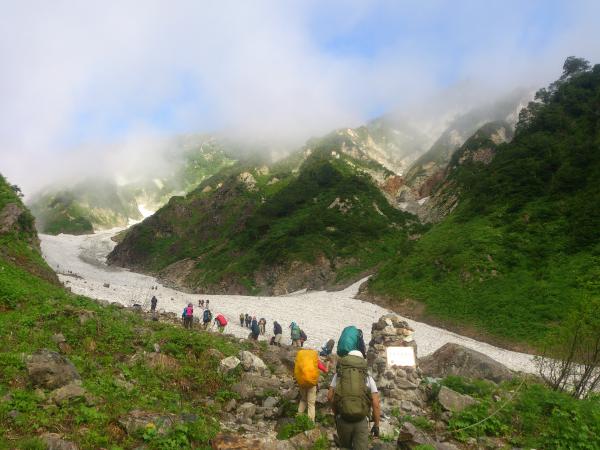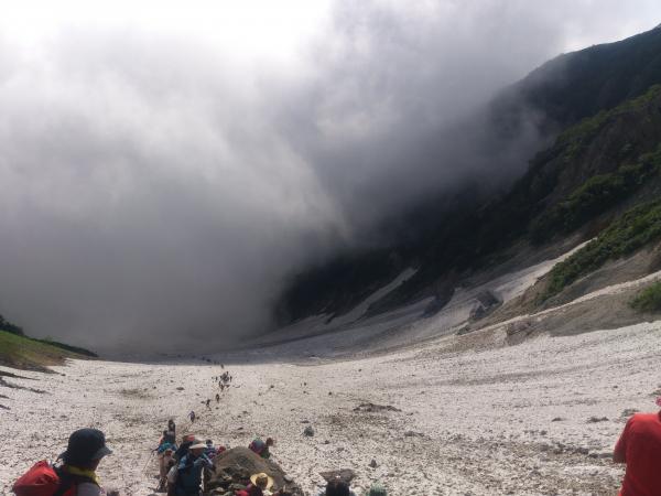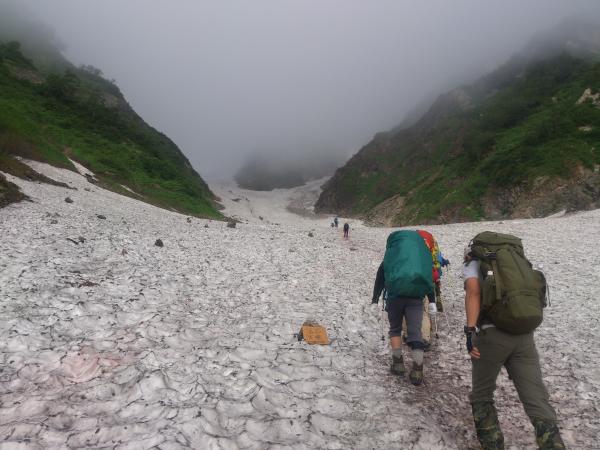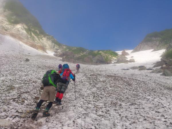 下りはサクサクと進んで行き、大雪渓に再度突入。ただし今回は降りなのでさらに注意が必要です。転ばないように注意しつつ降りきりアイゼンを外していると、雪渓の上部から1m以上の石が猛スピードで他の石を吹き飛ばしながら滑り落ちてきました!幸い登山者には当たらなかったようですが、想像以上に恐ろしかったです。雪渓通行時は常に上部に注意して歩きましょう。16時すぎ下山完了。