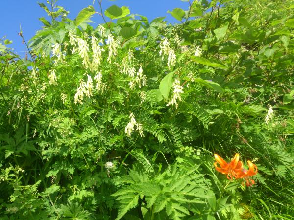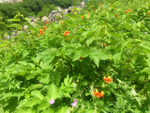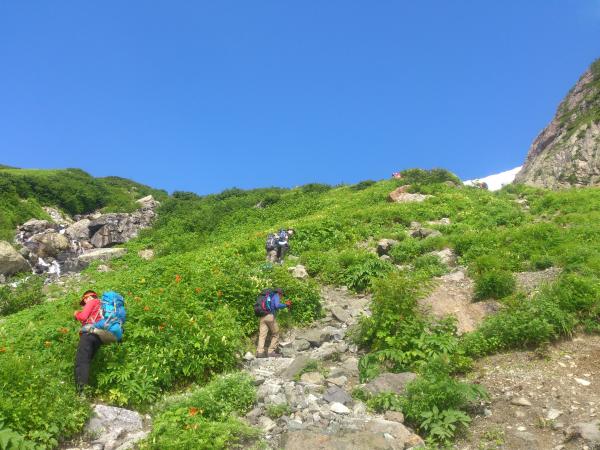 白馬尻小屋~大雪渓~白馬岳頂上宿舎 大雪渓は6本爪以上の軽アイゼンがあるといいでしょう。4本爪やチェーンアイゼンで歩かれている方もいましたが、滑ってしまい歩きづらそうでした。大雪渓を超えると石段が続きます。キレイな花が見所です。