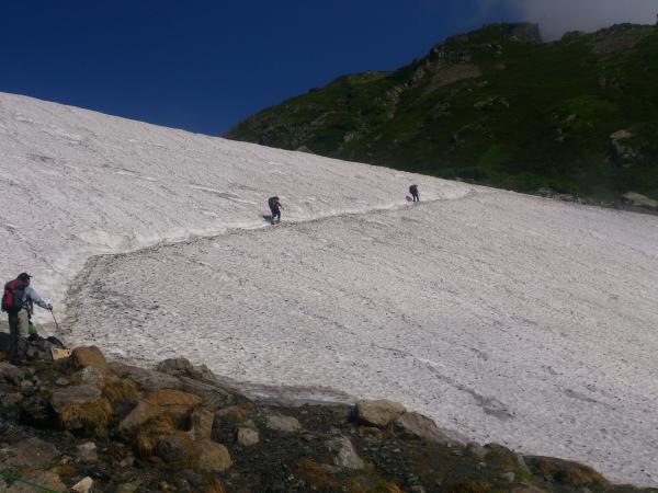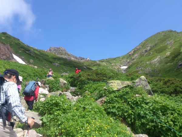 小屋を出ていざ大雪渓へ。15分程でアイゼン装着ポイントに到着します。6本爪アイゼンをつけ雪渓へ突入!ザクザクと雪を踏みしめて進んで行きます。スタートからガスっていた空がこの辺りから晴れていき、見上げてみると青い空、緑の山、白い雪とコントラストが素晴らしい!天気にも恵まれて、90分程で大雪渓終了。アイゼンを外し、岩場歩きになります。ここからはお花畑が続きます。色鮮やかな花々が目を引き、皆さん熱心に写真を撮られていました。しばらく行くと小雪渓のトラバースに着きます。足場は作ってありますが、昨年滑落者が出たようで「アイゼン着用お願いします」と看板が出ています。短い距離ですがしっかり準備しましょう。トラバースを超えて岩場・石段を進むと白馬頂上宿舎に到着です。