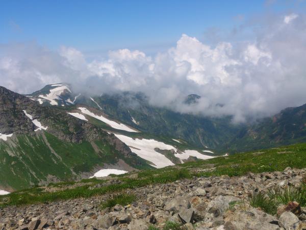 小休止をして白馬山荘、白馬岳山頂へ。この辺りから雪渓歩きの疲れ、暑さからペース上がらず。。それでもなんとか山頂にたどり着き景色を堪能。少し時間をとって体力を回復させて、残るは下山のみ。来た道を引き返します。