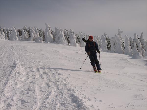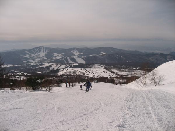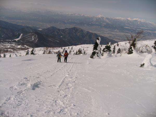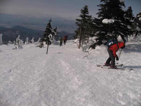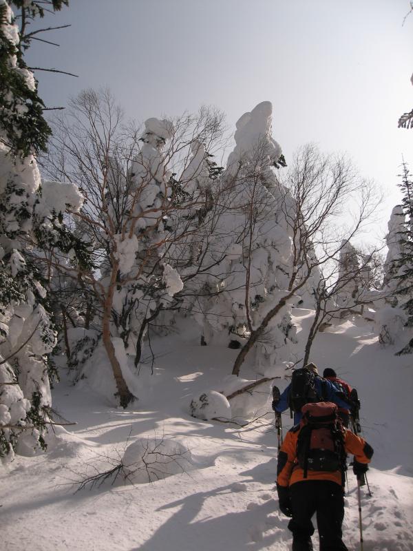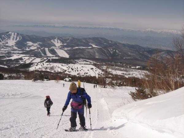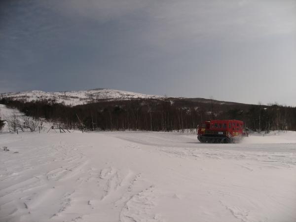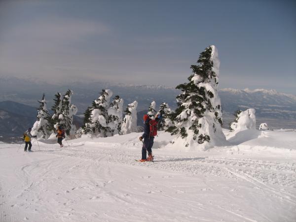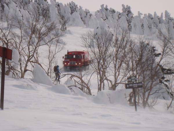 この日は前日までの悪天が嘘のような快晴。雪上車に何度も抜かれながらも汗をかきながら黙々と山頂を目指す。根子岳といえばヘリでの輸送が有名だが、現在は雪上車に変更。その名も「スノーキャット」。なんとなくジブリの猫バスを想像してしまうが、こちらは料金が3000円で運行期間は1月上旬から3月末ごろまで。