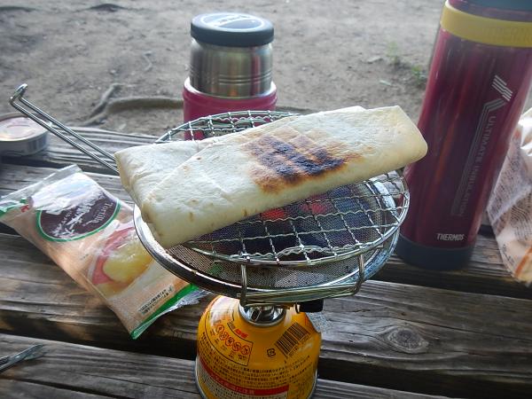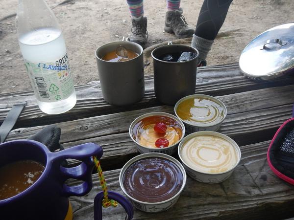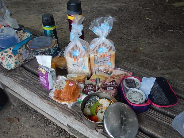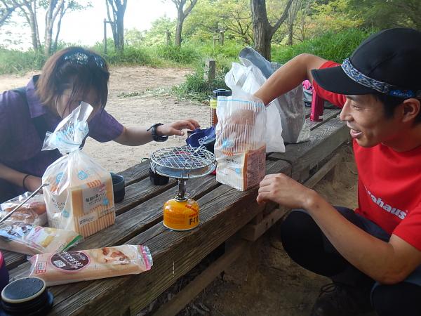 さて、今回のメインイベント、山頂で朝食。各自思い思いのものを持ってきたのでとても豪勢な朝食が出来上がりました。ベンチもあり、木陰あり、景色も満喫でき岡山市内からすぐのところにこんな素敵なスポットがあるとは!
