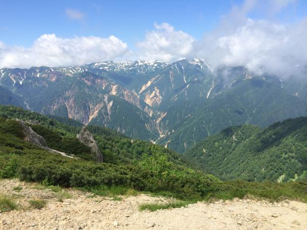 稜線に着くと目の前が開け、北アルプスの山々が連なりが見えます。