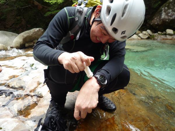 私は沢登りとクライミング経験が乏しいため、随所でお助け紐(スリング)を出してもらい、引っ張り上げて頂きました。いつも通り、何度か岩に膝をぶつけて、青あざだらけにはなっていました。