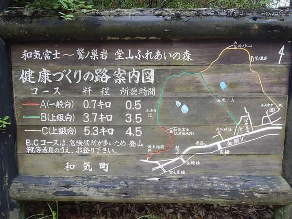 - 和気健康つくりの路登山口-(15分)-和気富士(北曽根城跡)-(20分)-「和」文字かがり火-(50分)-穂高山-(15分)-竜王山-(60分)-神ノ上山ー(45分)-安養寺下山
