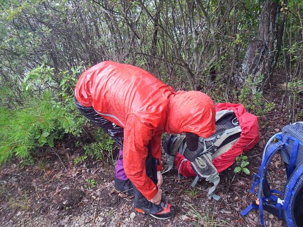 さっそうと穂高山に向かい歩いて行く途中、やはり雨が・・・雨具をいそいで装着。