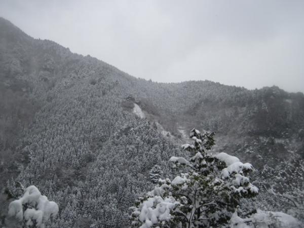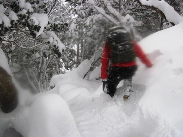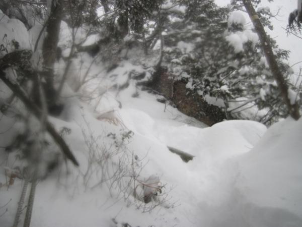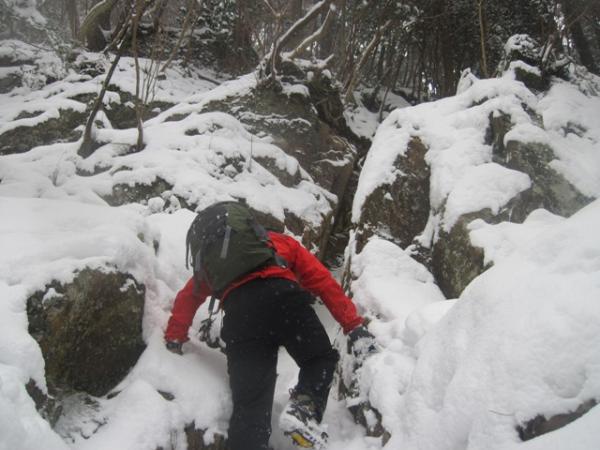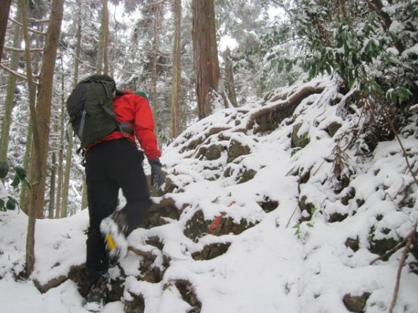 登山口からいきなり急登で登るにつれて積雪も増します。岩場には鎖場がいくつかありますが数日降り続いた雪で完全に埋もれていました。念のためにもっていたロープが役に立ちました。