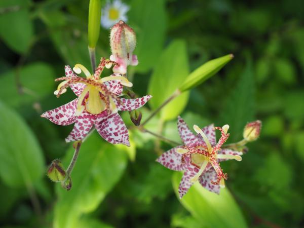 駐車場から右に進み林道を登って行く。側面には早速“ヤマジノホトトギス”がお出迎え。蛇行する林道をショートカットできるように登山道が整備されており、登り切ると“中山峠”に着く。