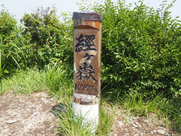 進路を右に取り登って行くと“頂上直登”と“平谷越”経由の分岐になる。やっぱり直登でしょ、ってことで分岐を左に。急登であり、岩場や鎖の設置などもあるがそんなに難しくはなくグイグイ登る。“平谷越”からの登山道と合流して左に上がると、佐賀県最高峰の“経ケ岳(1076m)”に着く。山頂には立派な標柱があり、そんなに広くないが展望もある。落ち着いて休憩したいところではあるが、夏の風物詩“虫の大合唱”により断念。そそくさと山頂を後にする。下りは“平谷越”経由で中山峠に戻った。
