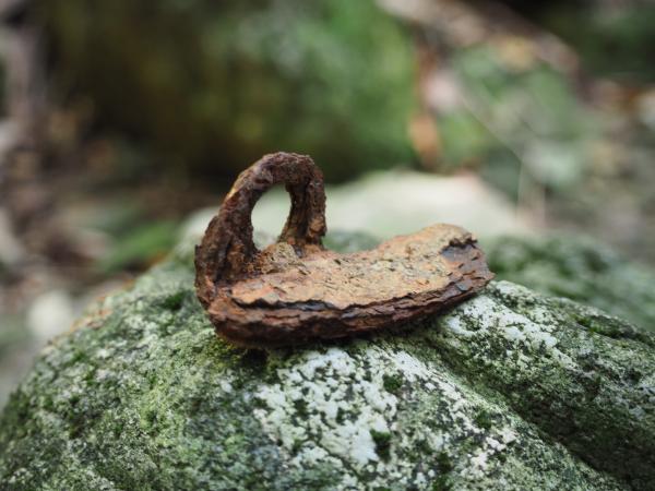中山峠から今度は“金泉寺”に向かう。基本的にはトラバースなので起伏も少なく歩きやすい。木々に囲まれている登山道は多少なり涼しく感じる。途中に大きな岩壁があり、クライミングができそうなどと話をしていたら、足元に錆びて朽ち果てた“ハーケン”を発見。やっぱり。