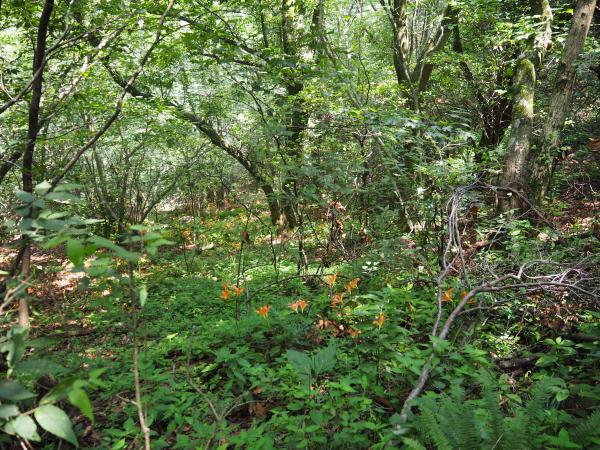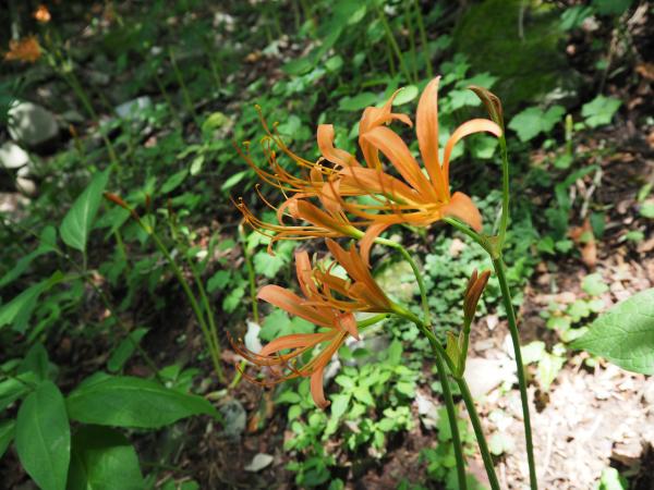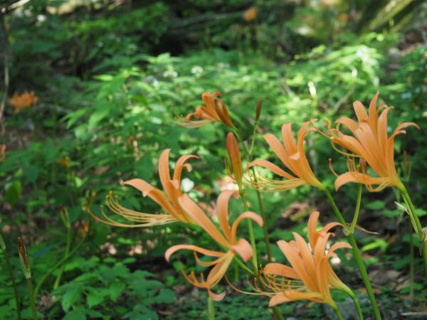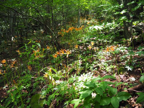 道標に従い進むと、早速目的の“オオキツネノカミソリ”とご対面。進むにつれ、どんどん増えてくる。見下ろすと斜面にもオレンジ色が点在。足元の石が苔に覆われているのでよそ見をしていると滑りそうだ。慎重に足を置きながらひと登りした所で分岐になり、まずは“金泉寺”に下る。