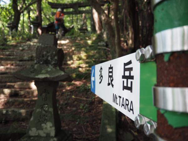 山小屋の前の坂を上がると分岐があり“多良岳”に向かう。石段を登って鳥居をくぐる。ロープが設置されている急登を越え、“国見岳”の分岐を右に進む。そして石段を登りきると“多良岳山頂(966m)”に着く。
