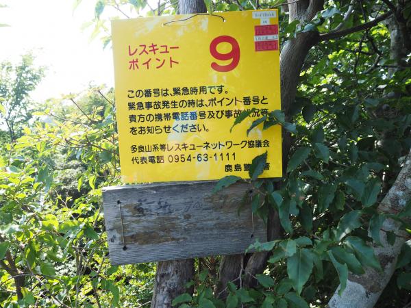 上宮の右奥が登山道でちょっとだけ展望もある。急斜面を下り、尾根上を進む。全体的に細く、部分的に高度感もある。途中に梯子があり岩の上に立つと360度の展望。ここが“座禅岩”?特に示すものはないので判断に困る(調べたところ特に決まってないらしい)。ちょっと藪漕ぎみたいな感じもあるが、今日はザックが小さいので気にならない。開けた所に出たが、そのまま通過。それにしても下っている。おかしいと思い戻ってみたら、その開けた所が“前岳”だった。「レスキューポイント9」の看板の下に薄くなっている字で山頂を示していた。読めん!!てか見えん!!進行方向の背中側にあり見落とした。戻ってくると正面になるので気が付いた。よかったよ。やれやれだ。そしてピストンで分岐まで戻る。