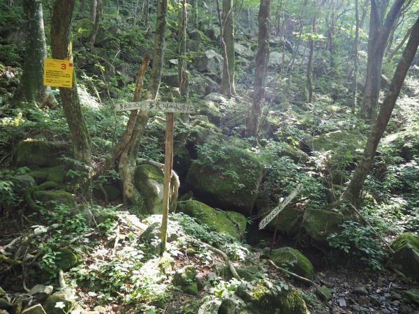 中山越から笹ヶ岳へは岩場が多く苔が付いて滑りやすくなっています。