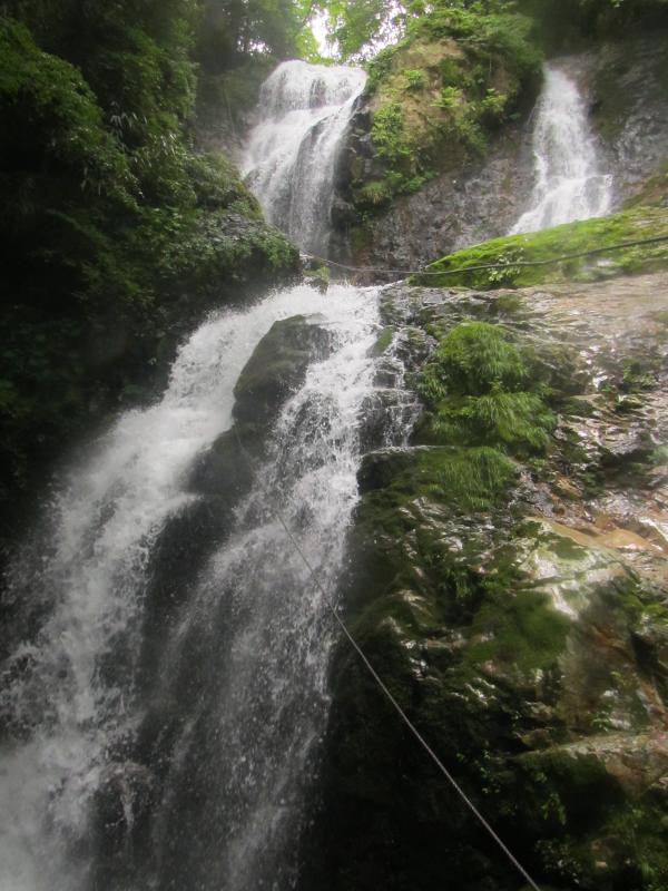 中央リッジを登れるそうですが、左手の男滝側から容易に巻くことができ、その先で核心部の一つ「明神滝」30mが圧倒的な迫力で迫ります。30mながら水量豊富で、爆音を轟かせながら白くたぎる豪快な渓相に心を打たれました。