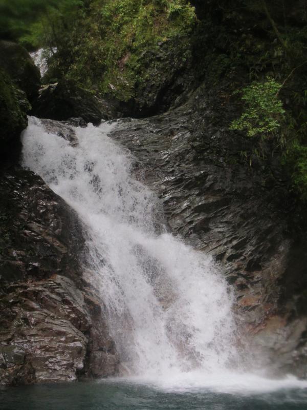 そしてまた廊下へ。長淵の詰まりに3m滝があり、泳げば突破できそうでしたが、体力の消耗を嫌ってあっさりと右手から巻きます。滝上は末広がりの斜滝10m。優雅な美しい渓相に息を呑んでしまいます。滑りやすい左手の水線際を微妙なバランスで乗り越えると、行く手にすっきりとした10m滝。右岸の踏み跡で難なく越えると、2条12m「男女滝」へ。