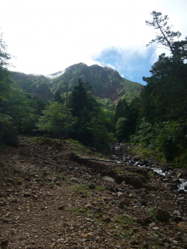 小屋手前の河原から見上げた赤岳は遠く、「登れないかも」と弱気な気持ちに。
