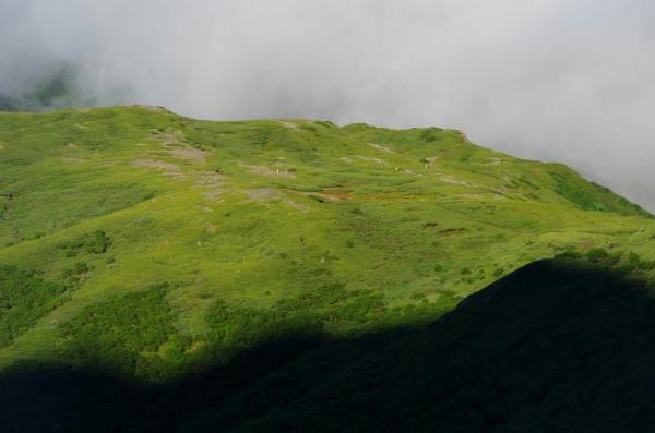 兎岳、小兎岳、中盛丸山とピークを超えていきながらも雨風は弱まらず、厳しい山歩きになりました。