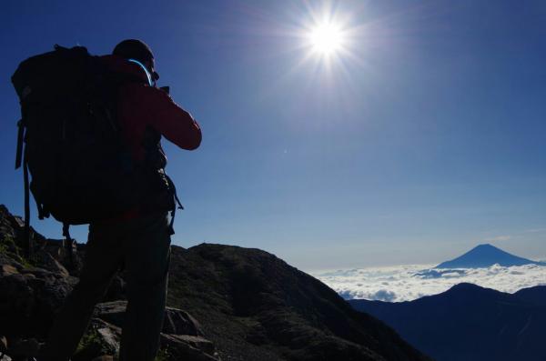 赤石避難小屋が見えるところまで登ると、雲海の上に富士山が見えました。