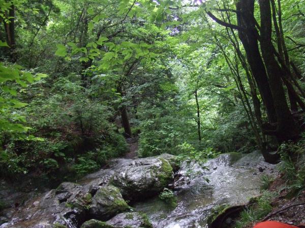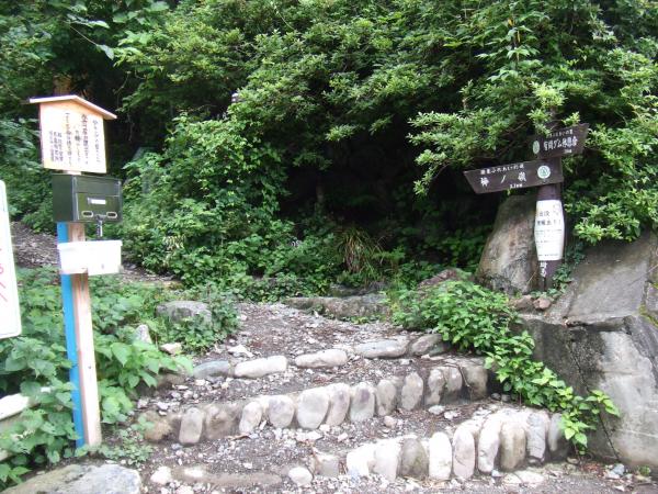 - 沢登りスタート地点は、登山口を登ってすぐに沢に降りられる道があります。