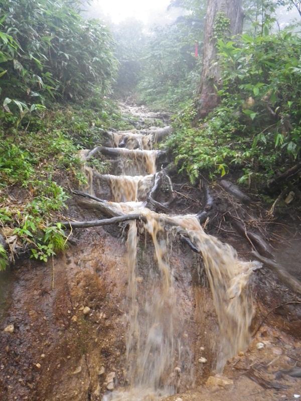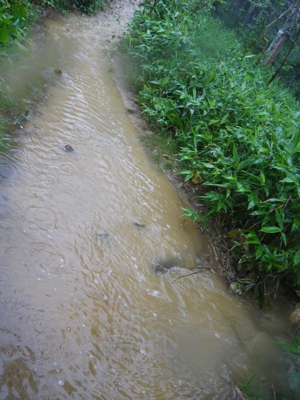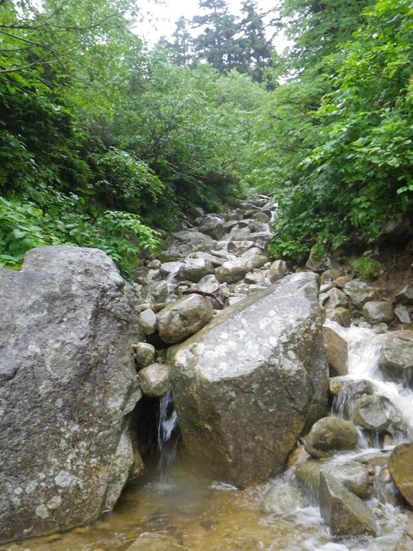 土砂降りのため登山道が川のようになっていたので、靴を浸水させずに歩くのには苦労しました。ゴアテックス仕様ではありますがなにせローカットの靴。つま先立ちを駆使して岩や木の上を飛ぶように歩く感じはほぼ沢登りの世界です。結果、山行を通して浸水は無し。靴の中はドライに保てました。歩き方次第でイケるものです。