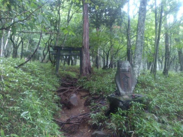 神社を通り抜け登山開始。さあ出発!、、、と思ったら頭上から1mほどの木の枝が1本、2本。何事かと木の上を見ると、なんと子ザルがポイポイと木を落としてきていました!可愛いけど危ないよ。。^^;サルに気を付けつつしばらくは急な林道を登っていきます。30分ほどで車道に出てそのまま進むと4合目の鳥居へ。