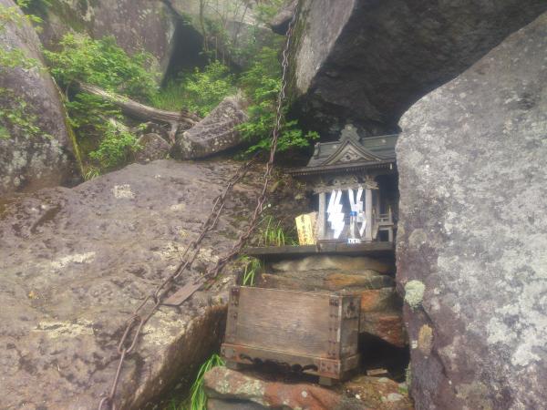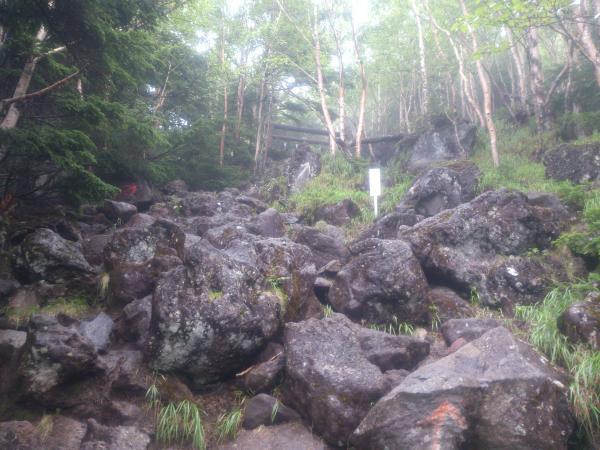 4合目鳥居からはさらに急登に。ほぼ岩場になるのでストックは片づけて、しっかり両手を使い登ったほうがいいかもしれません。段差も大きくバランスを崩しやすいのでご注意を。