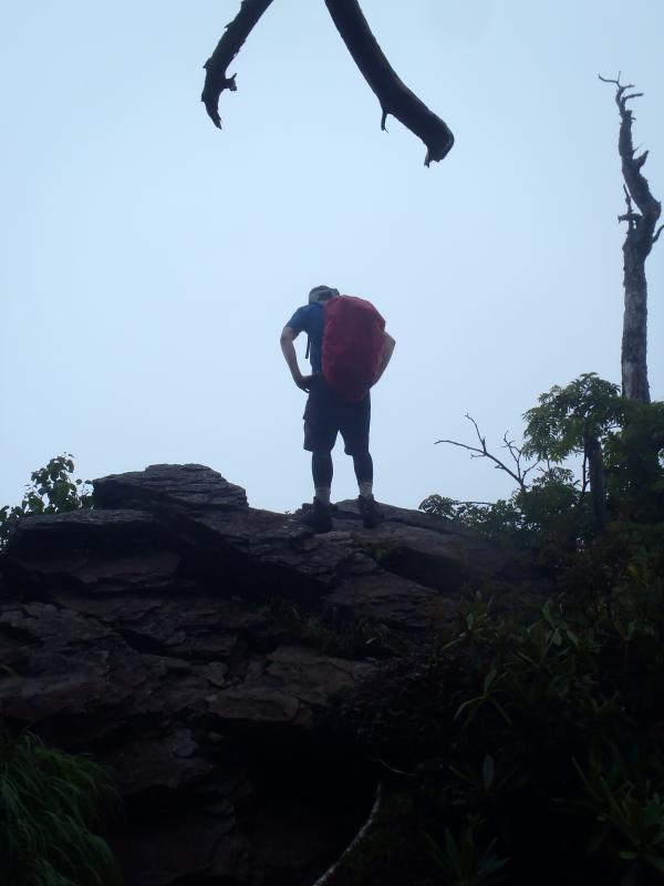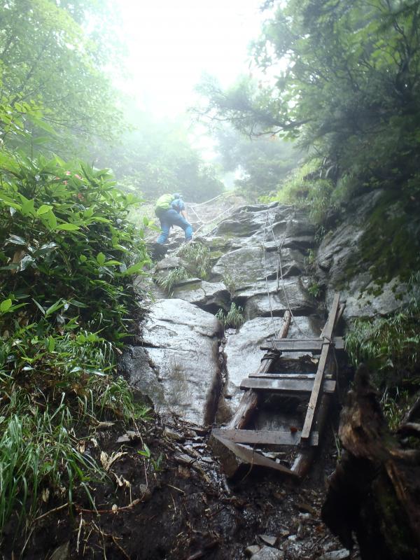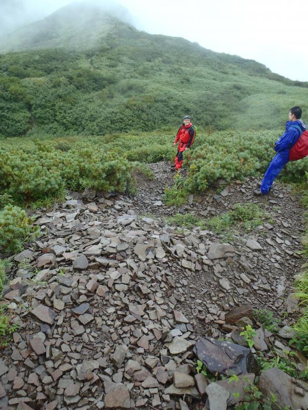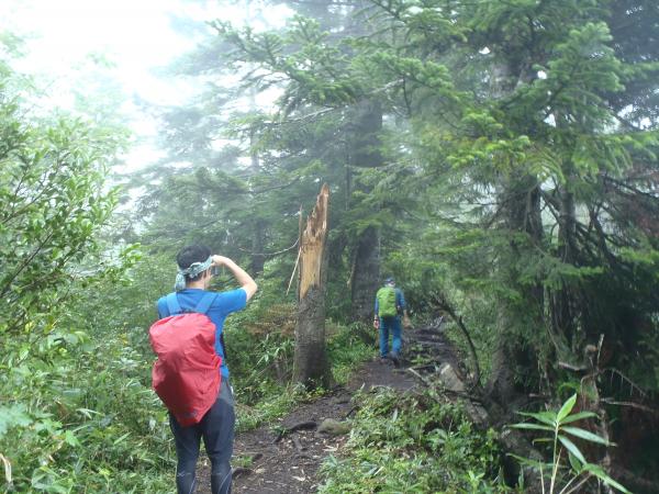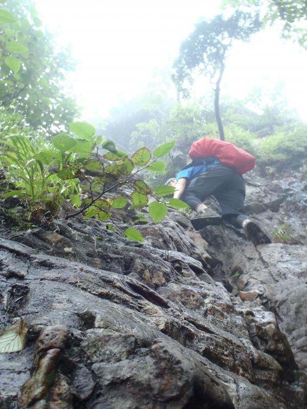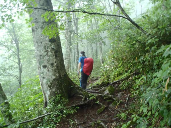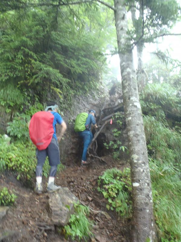 下りはグズグズの登山道を慎重に下っていきます。岩、木の根は滑るので注意が必要です