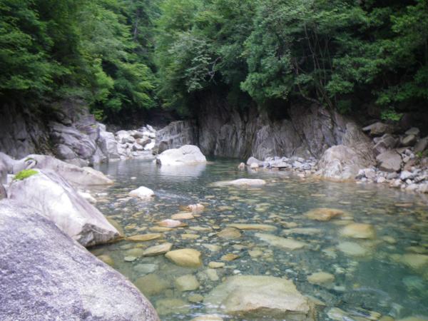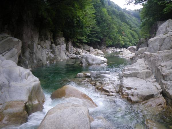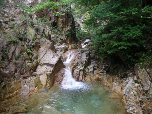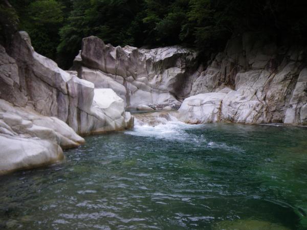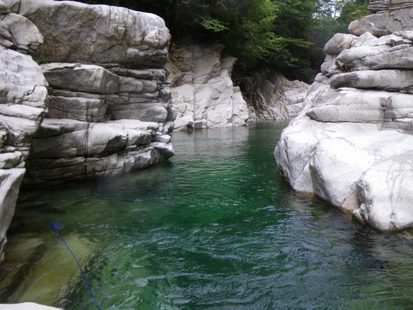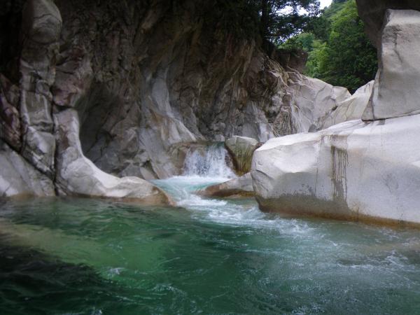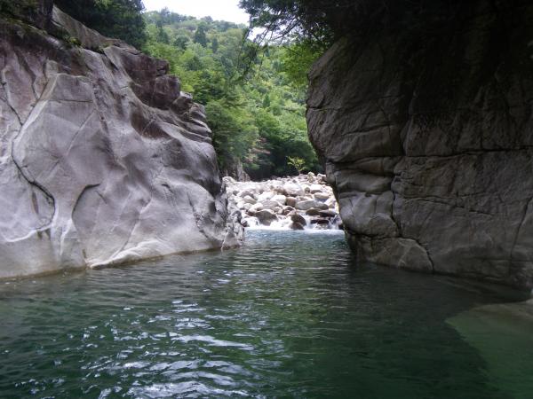 ③ツメカリ谷出合まで4・5回深い釜がありますが、そのうち1か所だけは水流が強く、滝の手前で岩に逃げ ます。他は泳いで抜けれます。