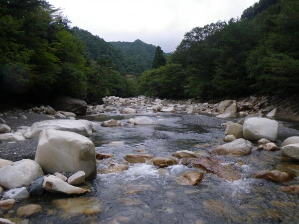 ②入渓は取水口手前から河原に降ります