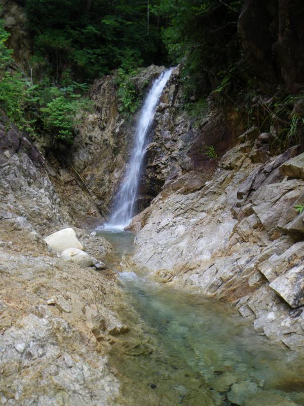 神崎川本流の遡行対象は取水口から大瀞までですが、とぎれとぎれですが過去5回ほど行っています。それほど何回来てもいい沢で、特に晴れていたら明るく、白い岩ときれいなグリーンの釜がおがめた上に、快適に泳げます。しかし、今回は雨交じりでやや水も冷たい感触。そこで、途中のジュルミチ谷に入り、銚子ヶ岳へ抜けてみました。