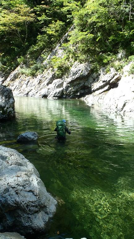 ほとんどゴーロですが、400mS字峡の函滝、430m三股は高巻となります。いずれも明瞭な踏み跡がありますので問題ありません。明るく気持ちの良い川原歩きとなります。出合の456m二股は良いテン場です。