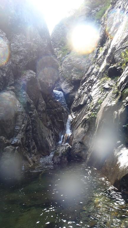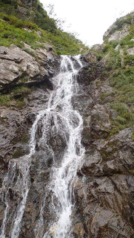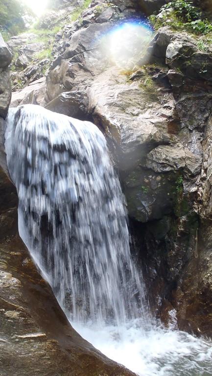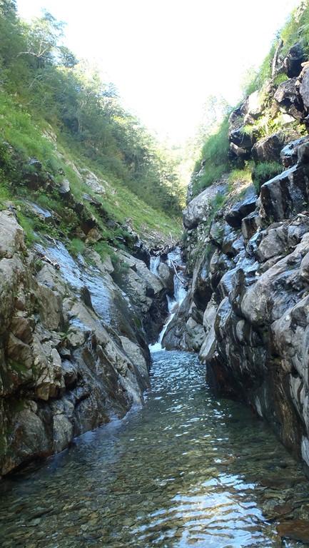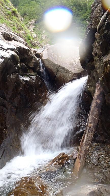所々平坦地はありますが、ツルツルに磨かれた岩盤状の険悪なゴルジュ、滝が連続します。850m二股までは大きな滝は少なく高い側壁を備えたゴルジュ主体の渓相です。一旦高巻くと沢床から50m~100mほど上がらねばなりませんし、途中からは引き返しは困難となります。850mからは20mほどの滝もいくつか出てきますが、直登可能ですが優しくはありません。