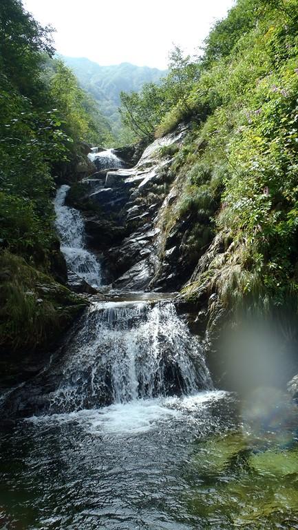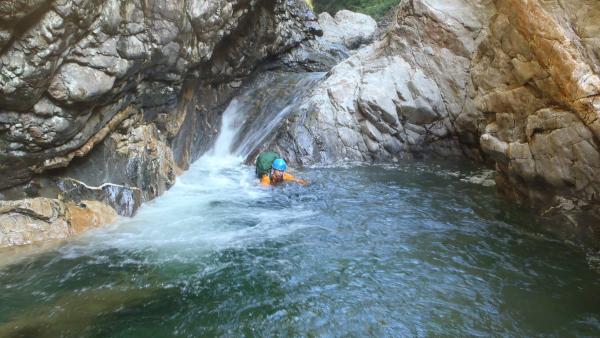 上部は滝が連続し、中流部から下は大滝に加えて岩盤状のゴルジュ、と多彩な渓相を持ちます。さらに565mから430m二股の間もゴルジュが断続して泳ぎや飛び込みが必要です。下降なら積極的に飛び込んだ方が早いと思います。中ノ岳沢ほどではありませんが、上級者向きの沢です。
