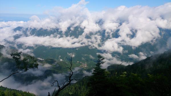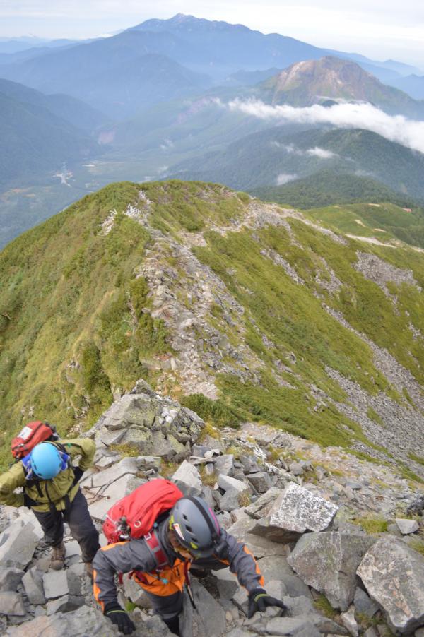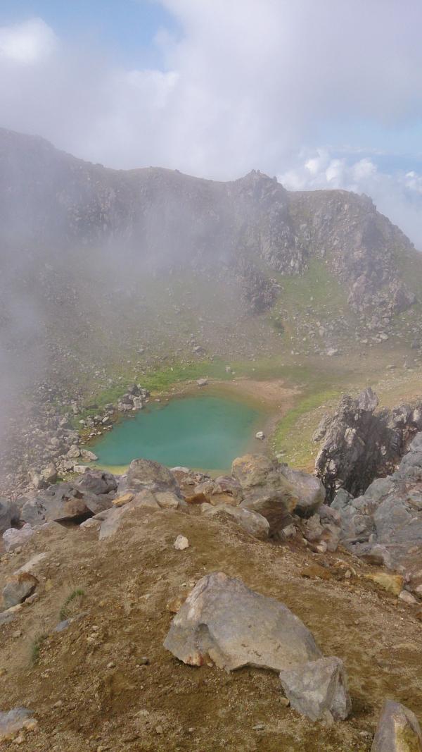 大きな荷物は山荘へ置かせてもらい、霧の中を出発です。南側へ進むにつれ雲から外れたこともあり、天気は良くなりました。