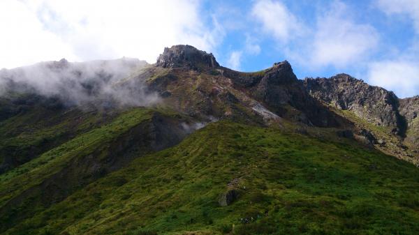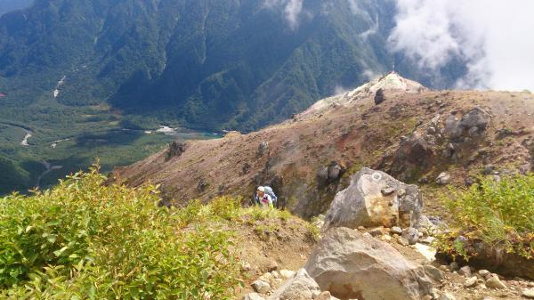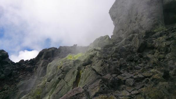 焼岳山頂周辺はガスが出ているところがあります。独標直下から先は十分な体力と技術が必要になります。