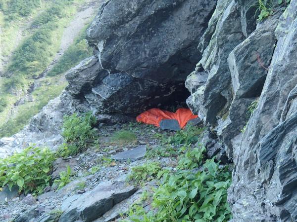 下部岩壁Dガリー大滝の2ピッチを登り、横断バンドを確認した後ロープ2本とクライミングシューズを残置して、テント場へ戻りました。