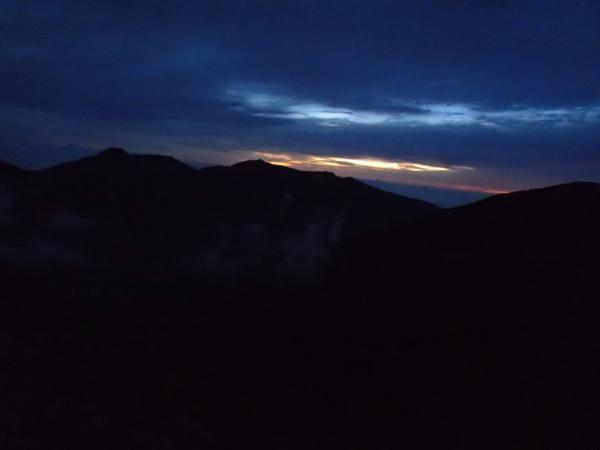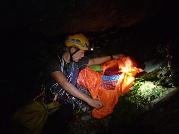 無論、辺りは真っ暗。ヘッドライトの明かりを頼りに進むこと2時間、昨日残置したロープとシューズを回収。