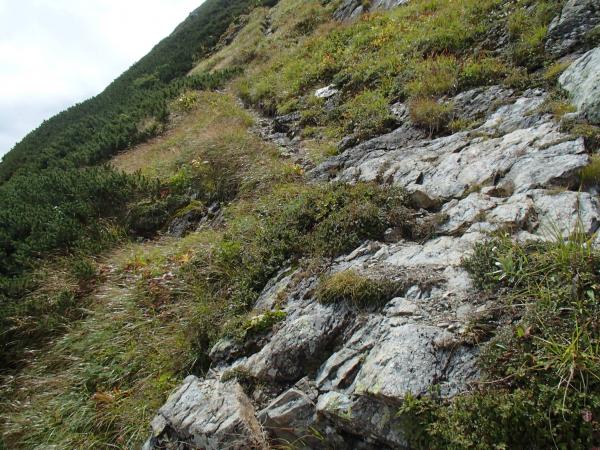 下部岩壁近くではガレてきて非常に安定しない足場になります。