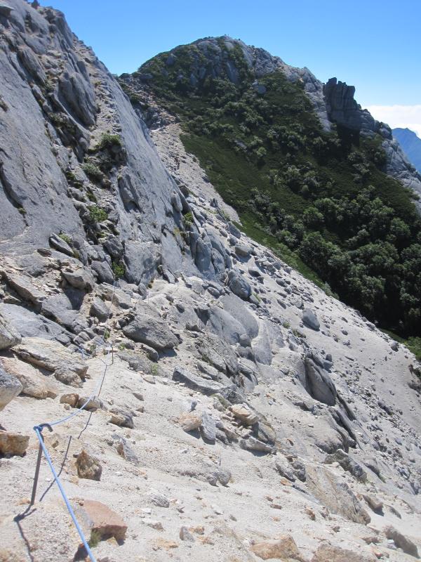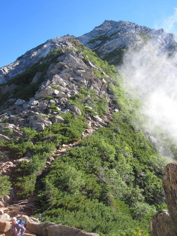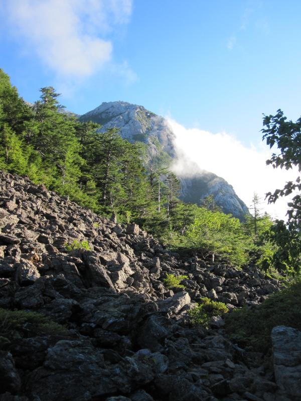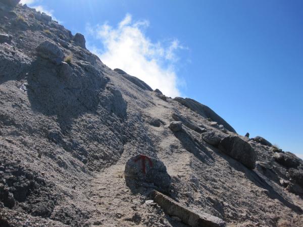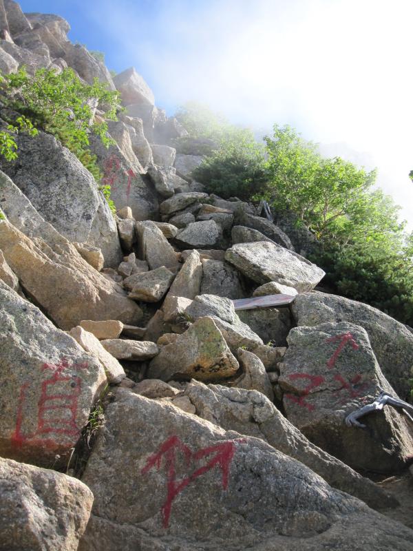 - 仙水小屋の少し先まで続く樹林帯を抜けると、急に景色が変わってゴロゴロの露岩が現れます。その上を跳ねるように進んで行くと、仙水峠の先は樹林帯の急登です。特に危険個所はありません。直登巻き道の分岐では、間違って直登に来た女性、間違って巻き道に来たおじさんに出会ったので、ペンキの道標を見逃しなく。岩稜直登コースは天気が良く岩が乾いていれば、すごく難易度が高いわけではありません。鎖はありませんので、しっかり持てるとこを持って三点支持を意識すれば問題なく登って行けると思います。登りに使う方が安全だと思います。山頂から摩利支天の周辺は砂の斜面。悪天時は要注意です。双児山のルートはハイマツと樹林帯の歩きやすい道です。道迷いもありません。