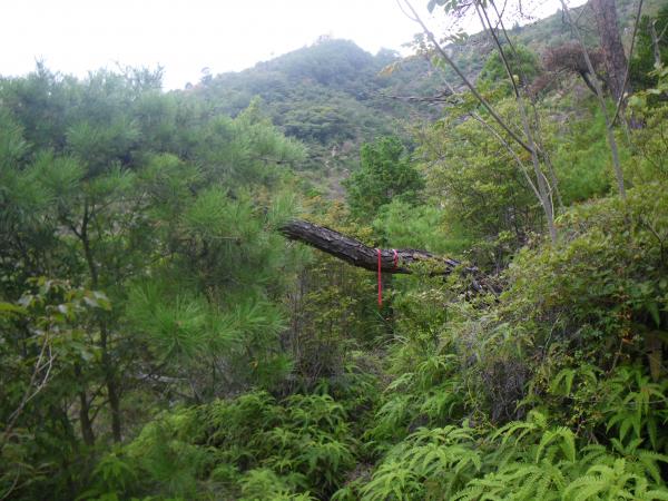 ⑥稜線から入日の滝までは最初はネットの張った一直線の急坂を下り、下りきった箇所から沢沿いにシダ類の藪をこきます。赤テープがありますが、暗く歩きにくい道です。