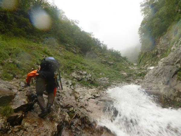 3週続けて日高の沢に入りました。札幌方面は大雨でしたが、今回入った山域は入渓可能ギリギリの水量。天候を睨みながらの遡行となりました。ガスに煙る岩盤状の深い谷は非常に迫力がありました。今回は水量、天候等の条件が厳しく巻きの多い遡行となりましたが、その巻きも微妙な泥壁・草付きの連続で決して容易ではありませんでした。日帰りでしたが、充実度の高い一日でした。