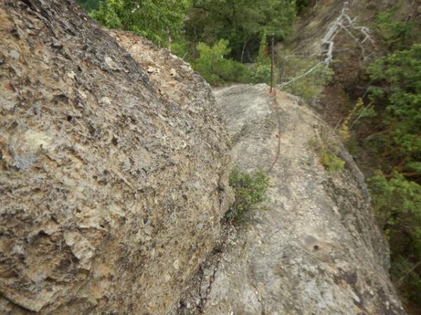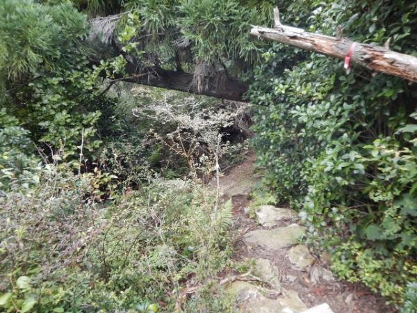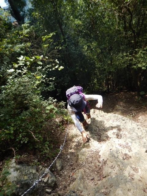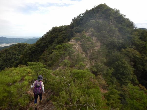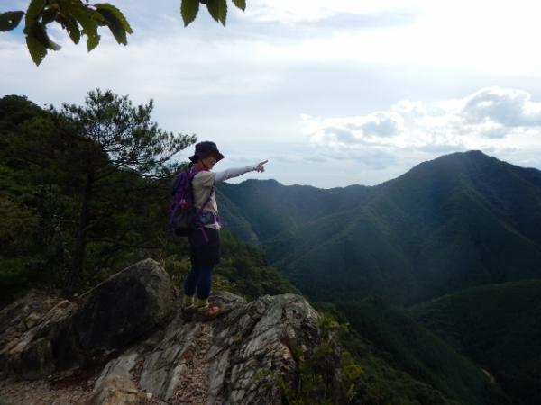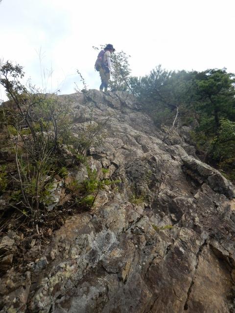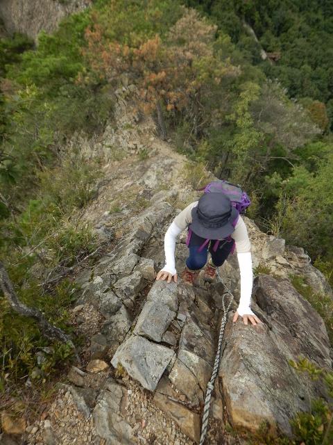 滝の上の神社で小休止をとり、50分ほど急登を登ると山頂に着きました。山頂から岩場を少し下りると、切り立った岩場のつなぎ岩につきました。絶景の眺めですが、怖いので手前でお昼休憩に。