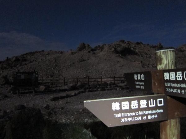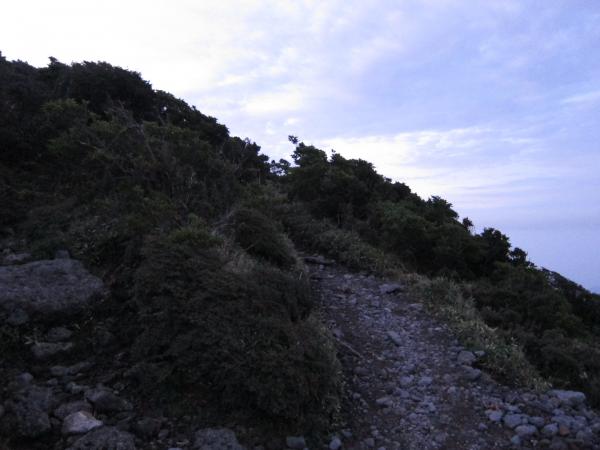 硫黄山を過ぎると樹林帯の中へ。月明かりは消え、足元は岩がゴロゴロ。