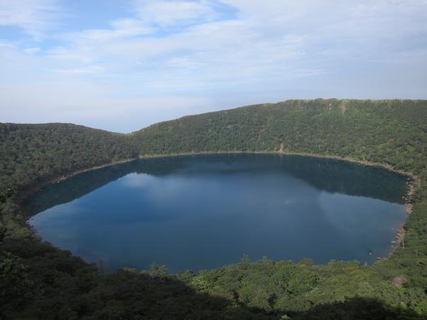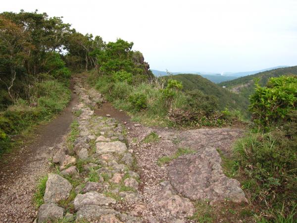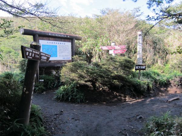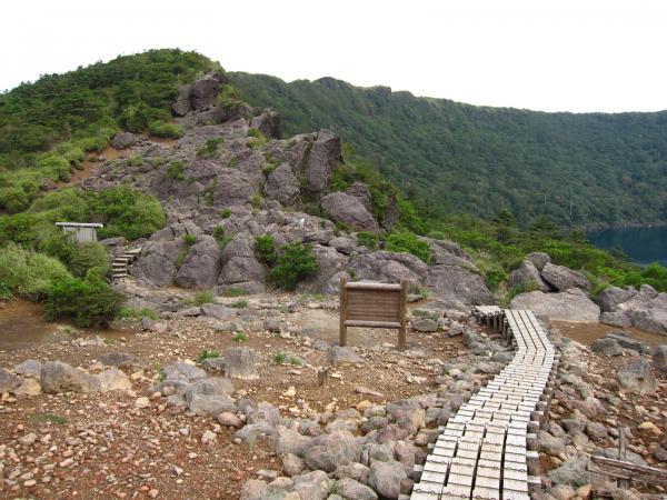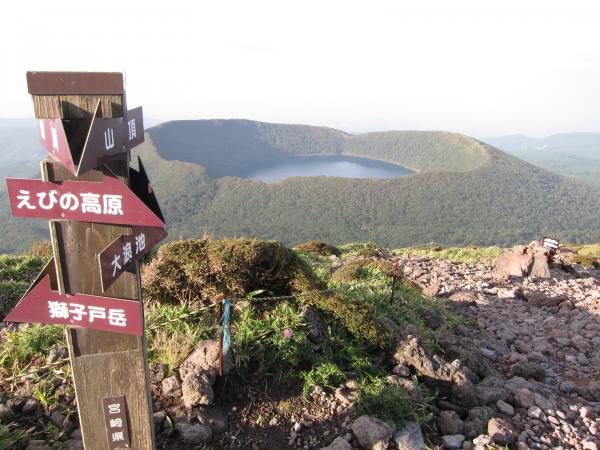 - 韓国岳登山口[1190m]→(50分)→五合目[1420m]→(30分)→韓国岳[1700m]→(40分)→大浪池巡り分岐[1330m]→(東回り40分)→大浪池登山口分岐→(東回り40分)→大浪池巡り分岐→(40分)→えびのエコミュージアム駐車場