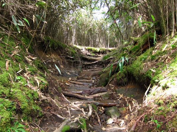 山頂から大浪池までの下山ルートは長い木階段が続きます。段差が大きい箇所も多いです。