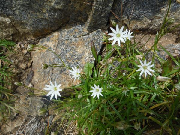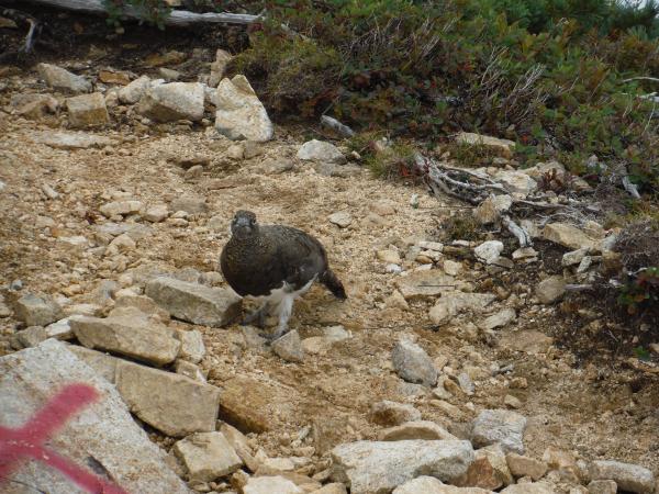 幸い雨にはなりませんでしたが、辺りは濃いガスに覆われ、久々の北アルプスでしたが、はて、ここはアルプスなのか?と首を傾げてしまいそうなほど不明瞭でした。しかし展望が無い時は、アルプスのアイドル・ライチョウが現れるチャンスです。いつ現れるかとワクワクしていると、丸山ケルン手前で早速発見!ハイマツの下から首だけ出してキョロキョロ。ギャラリーが集まったのを確認すると全身をお披露目してくれました。人馴れしてるみたいだけどカワイー(*‘∀‘)