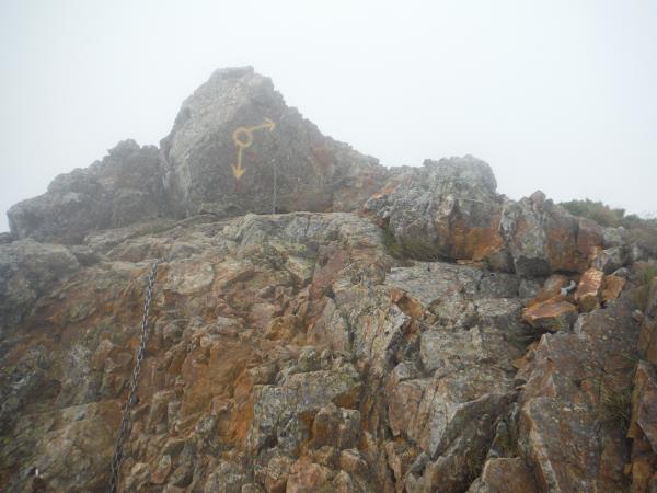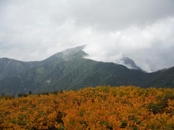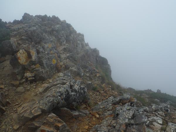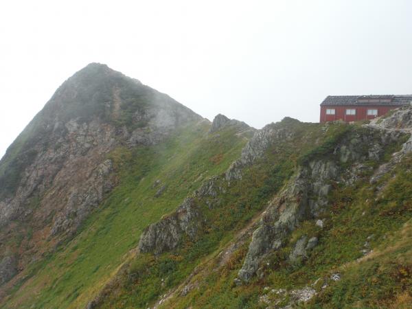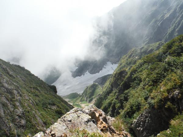 それからさらにガスの中を進み、唐松岳に到着。雲の中から時折垣間見える不帰方面は、切り立った岩稜が鈍く光っており、容易に近づけなさそうな雰囲気でした。山荘で腹ごしらえし、五竜目指してこの日の核心・牛首に突入しました。牛首…恐ろしい名前です。赤茶けた岩肌は脆く、霧に覆われた谷底は吸い込まれそうな程深く見えました。アップダウンも多いのでそれなりの根気が必要です。最低コルから先は、相変わらずのガスで、同じような景色が続いて特に長く感じました。途中でクマを見たという方もおり、五竜山荘の発電機の音が聞こえた時には正直ホッとしました。