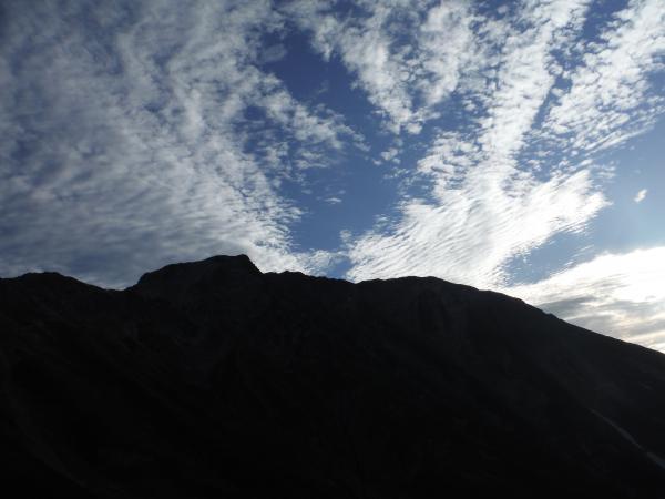 山荘で荷を解いているうちに天気はみるみる回復し、五竜名物・夕食の絶品カレーをいただいている時には、空が金色の夕焼けに染まっていました。おかわりを諦めて外に飛び出してみると、五竜岳が正面にドンと構え、西の毛勝三山に夕日が沈むところでした。そして東の空には真ん丸大きなお月様が。スーパーという程ではありませんが、兎が餅を突いている姿がはっきりくっきり見えました。テラスでのんびりお月見といきたいところでしたが、季節は既に秋、5分もすると鼻水がだらーんとする程寒かったので、明日に備え早めに就寝しました。