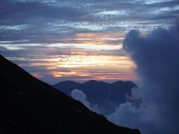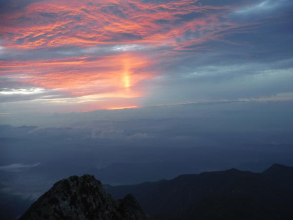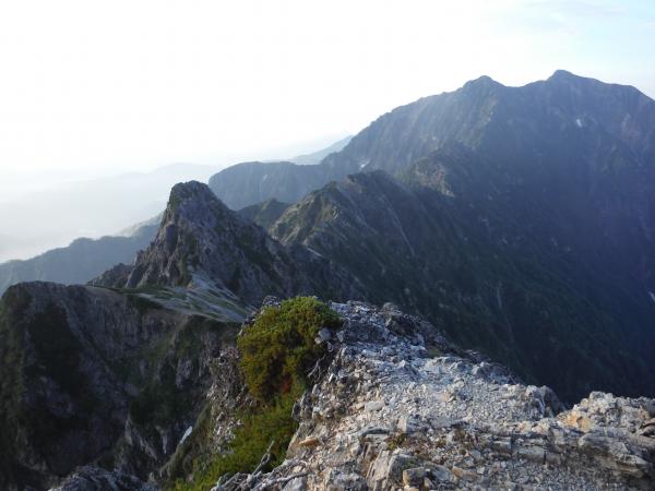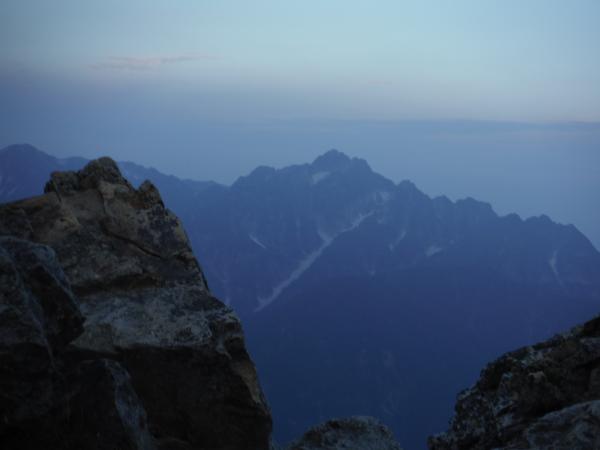 そして翌日は早朝4時半出発、群青色の空に五竜の黒いシルエットがくっきり浮かび上がっています。天気は良さそうです。遠見尾根の彼方の空から次第にご来光スペクタクルが始まり、燃えるようなピンクの太陽柱も見ることができました。山頂からは、これから挑む八峰キレットと鹿島槍の双耳峰が明るく輝いていたので緊張がいくらか和らぎました。西には立山と、着物の衿のような三ノ窓雪渓を抱いた剱岳が、まだ眠りから醒めずに静かに浮かんでいました。
